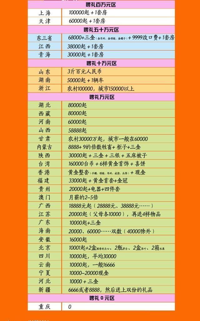 别的不知道,我大山西洪洞,我去年结婚,彩礼十三万八不包括三金(金戒指,金项链,金耳环)+县城一套房(最次得首付,首付10万)。我这在我们这算是低配了,有钱人家咱不说,就普普通通的人家我这是低配,有要的更狠的十六万八往上,没房子的还得额外压10万房子钱。哎,说多了都是泪啊