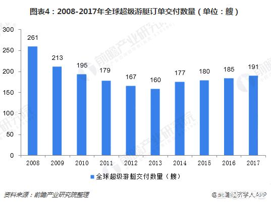 受2008年金融危机影响,全球超级游艇订单交付数量出现下滑,直到2014年才开始恢复增长趋势。2014年全球游艇交付总长度增长11.38%至8239米,平均长度也以46.55米创下新高。据不完全统计,2016年的交付数量在185单左右,2017年全球超级游艇交付数量达到191单。