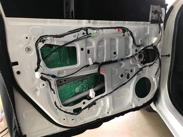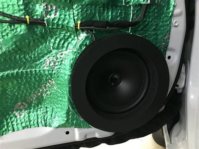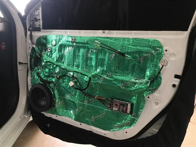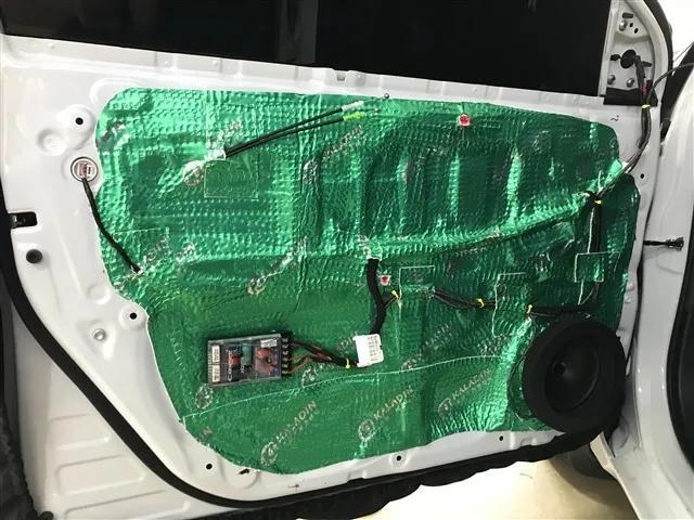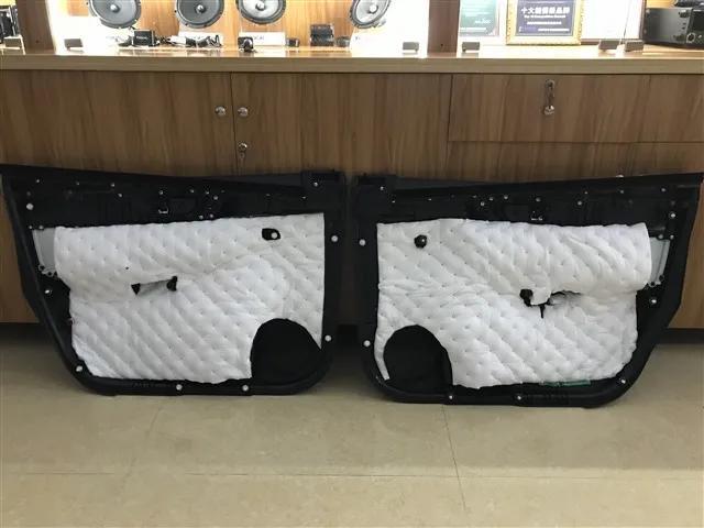由于原车门板隔音措施不足,门板位置成为了风噪和共振噪音的重灾区。对此,技师使用卡拉丁和吸音棉对门板进行了严密的三层止振隔音吸音处理,将门板严密包裹。有效的抑制了门板的共振,并且阻隔了风噪的进入。