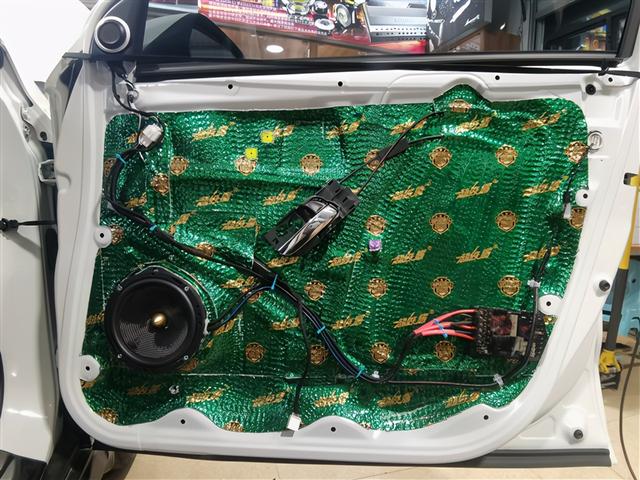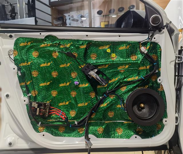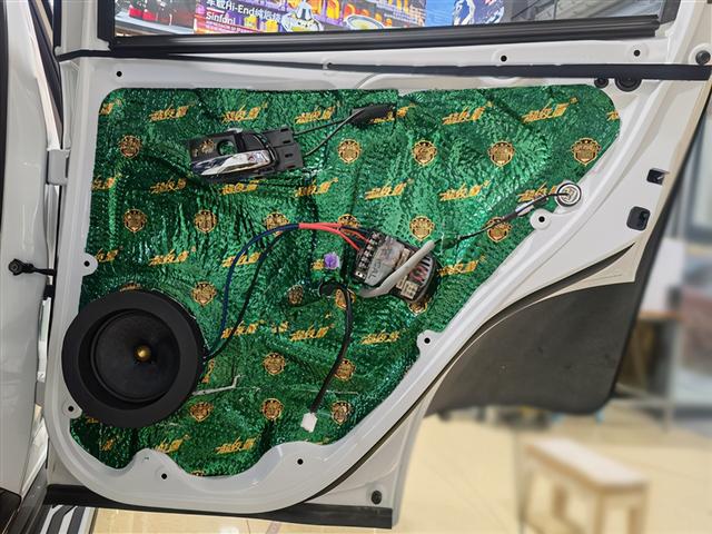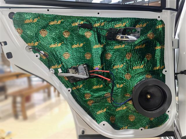 前声场作为主声场,原位安装一套性价比极高的法国劲浪165A-GL两分频套装喇叭,该喇叭善于高效利用每一毫瓦功率,且以极小的功率便能推动出美妙音符。个性鲜明音色和动感时尚的外观,令人赏心悦目。在喇叭的安装上采用的是原位无损换装的方案。高音喇叭原位安装在三角位,中低音喇叭原位安装在车门位置。进行喇叭安装之前首先做的还是隔音的处理,选用大能超级盾对门板做双层隔音,为声场喇叭创造一个良好的工作环境。