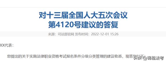 12月初,司法部公布对十三届全国人大五次会议上代表提出的《关于实施法律职业资格考试报名条件分级分类管理的建议》(第4120号建议)的答复:
