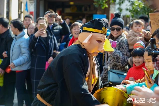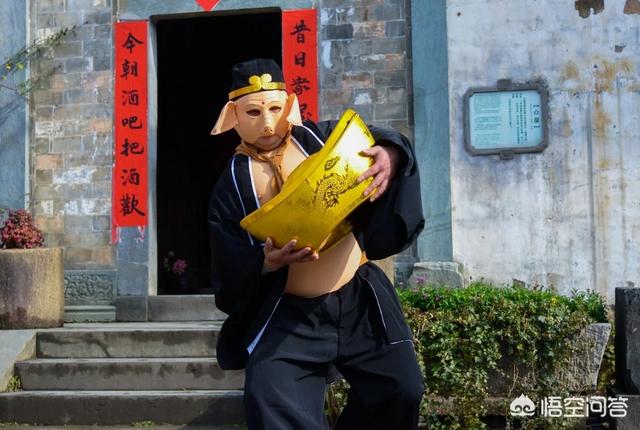 接下来是“金猪送福”。先是二师兄肩背大扒四处找寻着什么,忽然他发现了一个金灿灿的大元宝,他立刻扑了上去,赶紧捡了起来。接下来我们的二师兄可是艳福不浅啊,他手抱大元宝,站在众屋大门口,一个个漂亮的妹子是争相合影留念,大过年的,谁不想沾点喜气呢?