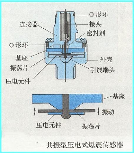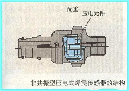 压电式特点:安装在发动机机体,利用压电效应把爆震时产生的机械振动转变成信号电压,当产生爆震时的震动频率与压电效应自身的固有频率一致时,即共振现象。此时传感器会输出一个爆震信号,由ECU及时修正点火时间,避免爆震。