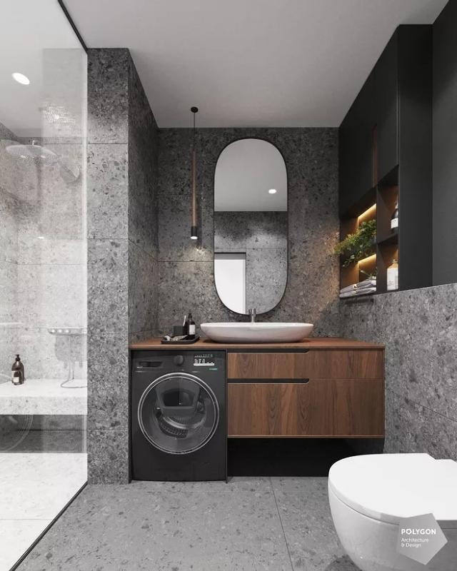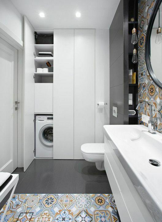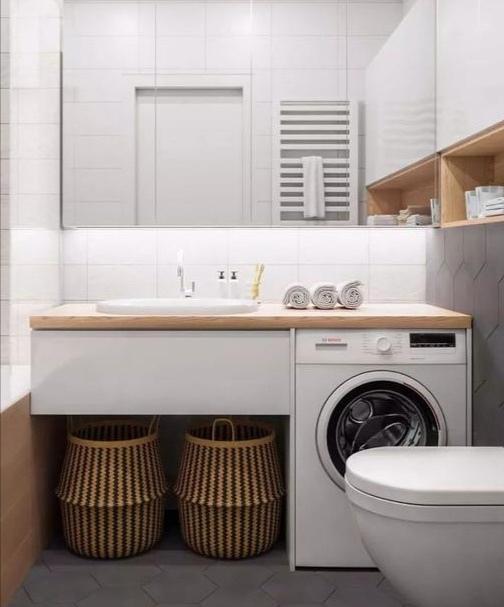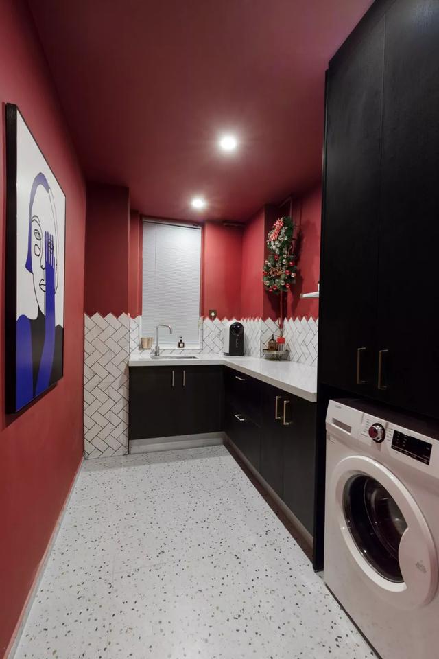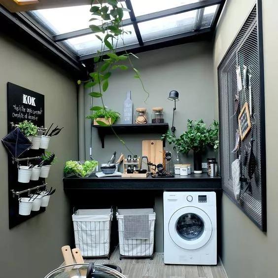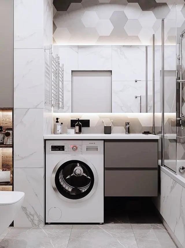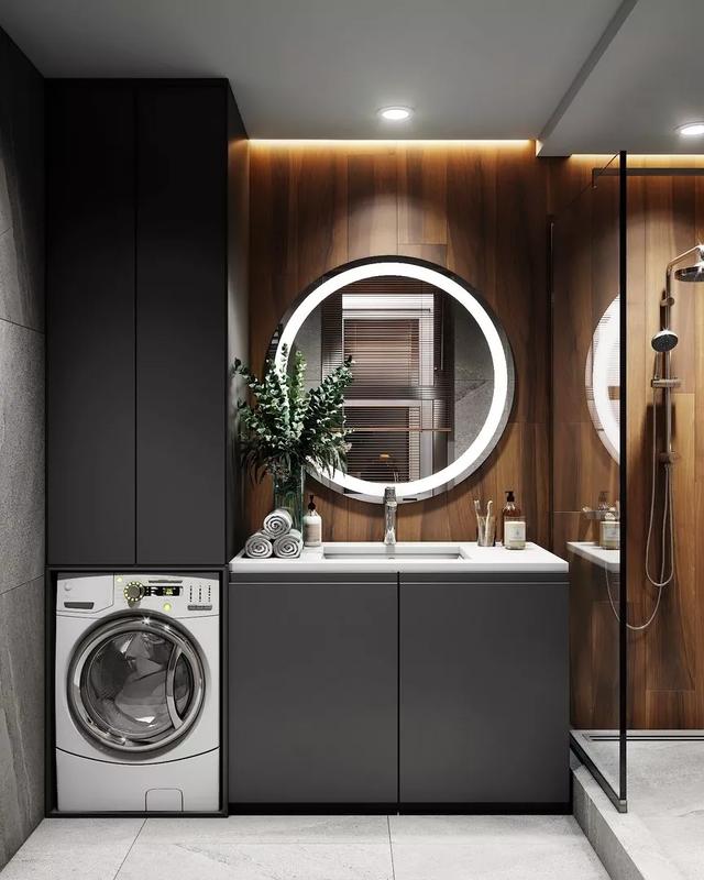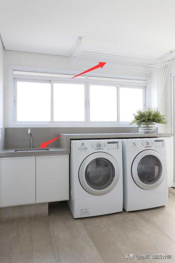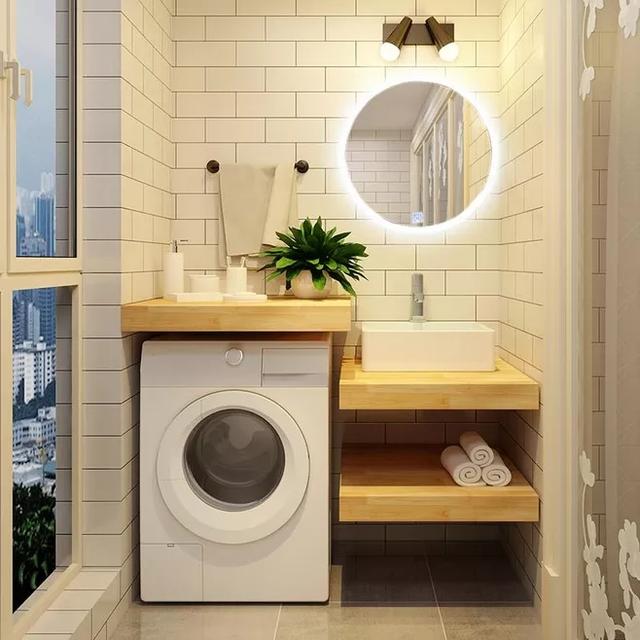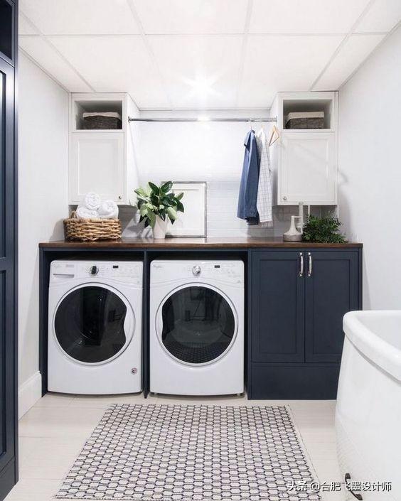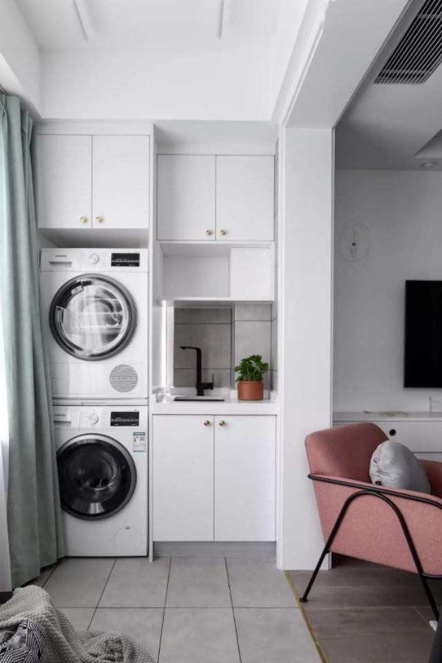 ③有条件的上面还可以加根晾衣杆,旁边增加洗衣槽的设计,和洗衣机上的台面形成高低差,以及空间层次感。小角落直接摇身变洗衣房,感觉赚大了!