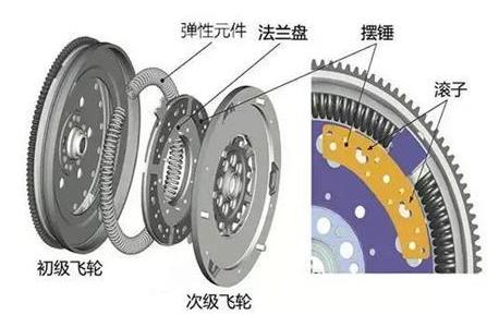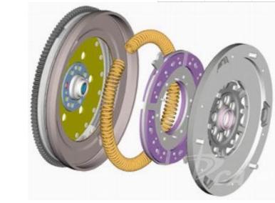 汽车上装有的飞轮是将原来的一个飞轮分成两部分,一部分保留在原来发动机一侧的位置,起到原来飞轮的作用,用于启动和传递发动机的扭动转矩,这一部分被称为初级质量飞轮;另一部分则放置在传动系统变速器一侧,用于提高变速器的转动惯量,这一部分被称为次级质量飞轮,两部分飞轮之间有一个环形的油腔,在腔体内装有扭簧减震器,通过减震器将两部分连接为一个整体,我们称之为双质量飞轮,借助这种系统可以隔离发动机曲轴的扭振,抑制扭振从发动机传到变速器。