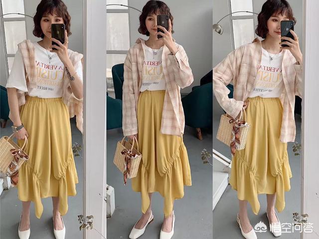 白色短T+格子衬衣+黄色半身裙:很少女系的颜色,看起来特别有活力,合适学生搭配哦