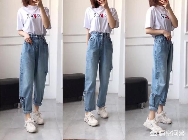 白色短T+牛仔老爹裤+老爹鞋:这就是学生最喜欢的搭配呀,时尚休闲百搭