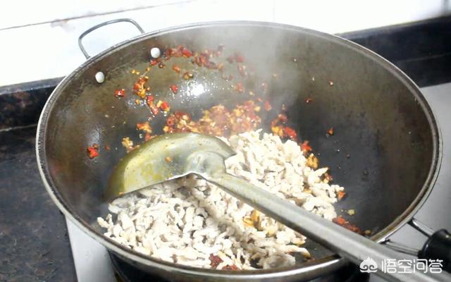 6 炒至肉丝变白后乘除备用,过下从新下底油加豆瓣酱,红泡椒沫、蒜末、姜末炒香。