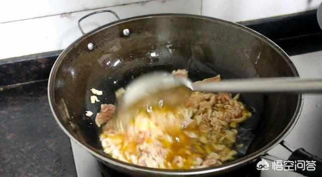 4 热锅下冷油(不粘锅),油温五成热后,下肉丝迅速划炒散开。