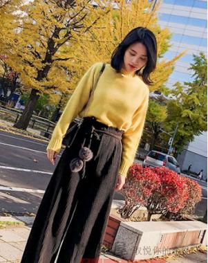 上衣选择一款黄色系的长袖毛衣,搭配上一款黑色的高腰阔腿裤,自然披散的头发,时尚百搭不二选。