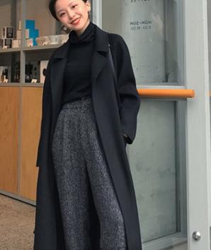 一身简约的黑色内搭,搭配上灰色系的高腰阔腿裤,外套一款黑色的长款大衣,白皙的笑脸,时尚百搭又保暖。