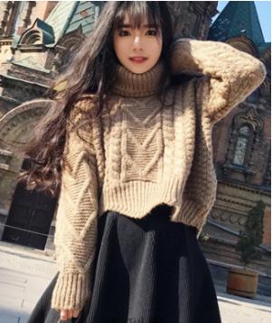 一身高领的卡其色系的短款毛衣,搭配上一款黑色的半身裙,时尚又减龄。