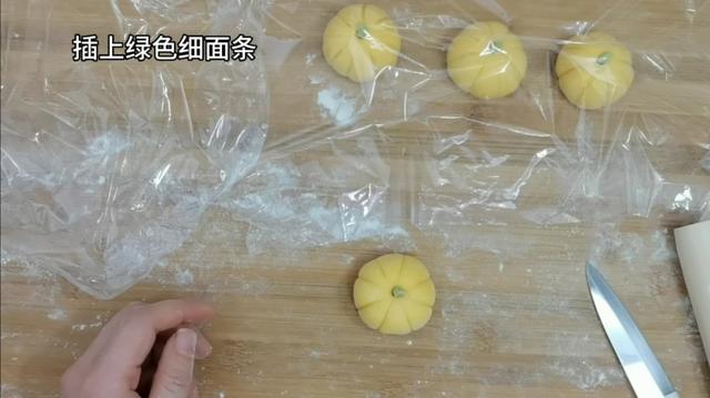 3.用一小点菠菜汁和一个绿色小面团,这个是做南瓜蒂用的;