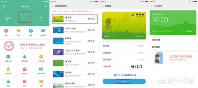 打开MIUI9系统内的小米钱包App,点击“公交卡”进入开通页面,选择“绿城通”,再点击“立即开通”然后输入密码/指纹、下载卡片即可。开通后的卡会显示为“已开通”状态。