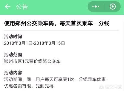 3月1日至3月15日,在郑州乘坐公交车,只要你每天第一次坐车时使用微信扫码乘车,就能够享受0.99元优惠。实际支付一分钱就能坐一次公交。其实早在今年2月8日,郑州公交乘车就已经实现扫码支付,郑州公交进入扫码时代。目前,郑州市内常规公交线路已全部实现扫码支付功能。
