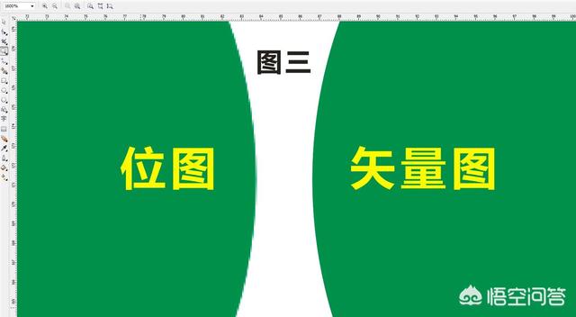如图三,我们同时将一个位图图形和一个矢量图图形放在一起同时放大1600%。可以明显的看见位图已经出现了锯齿马赛克现象。而矢量图没有。