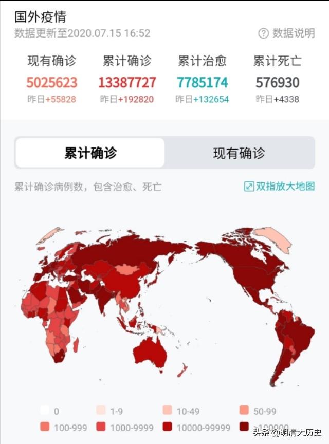 而进入21世纪所发生的非典、中东呼吸综合征、埃博拉疫情等都是集中在了某些国家与地区内,没有造成大范围的扩散,但是今年的新冠疫情首先从中国武汉爆发,在中国基本成功对疫情进行了控制之后,其他国家和地区却相继迎来了爆发期,现如今新冠疫情波及了全球215个国家和地区。累计确诊1338万人,累计死亡57万例,可以说形成了全球性的爆发。