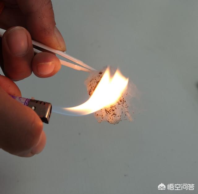 化纤就是一点就燃,跟上面蚕丝燃烧的感觉完全不一样。化纤燃烧以后是黑色硬块,用手碾一下,不会成为灰,依然是硬块。冒黑烟,有刺鼻味道。