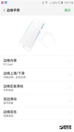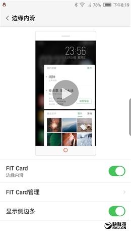 ↑↑↑除了之前已经加入的边缘上滑/下滑切换应用、反复滑动加速手机、双边滑动调节亮度、边缘双击快速返回等功能外,新增了边缘内滑开启FiT Card功能。