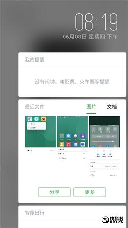 边缘向左滑动即可开启FiT Card功能,FiT Card类似小米、华为等手机的负一屏,集成了提醒(闹钟、火车票、电影票提醒)、最近文件、智能出行(自动判断上下班时间并规划出行方案)、手机加速(一键清理内存加速手机)等功能。