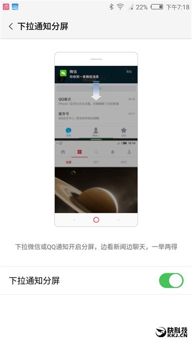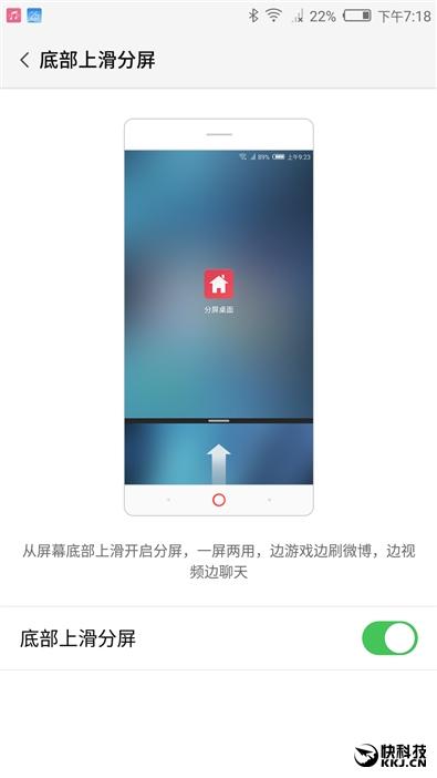 ↑↑↑分屏功能可以通过下拉通知或是底部上滑开启,需要注意的是,底部上滑开启分屏是从Home键区域上滑开启,从其它区域上滑则是开启快捷通知开关。