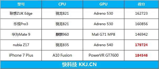 ↑↑↑通过对比看出,nubia Z17所搭载的骁龙835跑分远远超过了麒麟960、骁龙821,但比iPhone 7 Plus所搭载的A10 Fusion还略逊一点点。