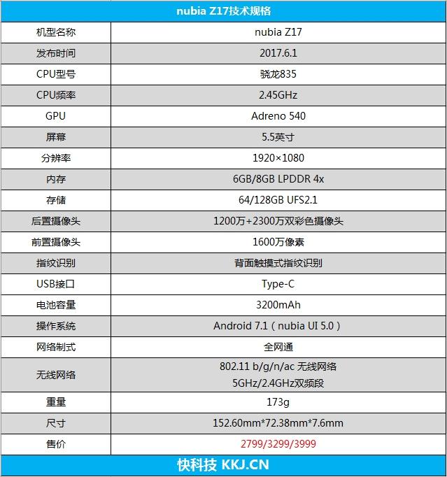 nubia Z17是第一款配备8GB内存的骁龙835手机,标配6GB内存,有64和128两种容量可选,UFS 2.1规格。