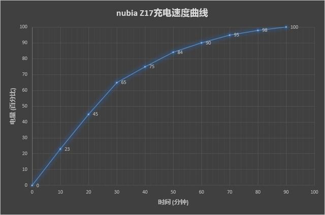 ↑↑↑nubia Z17前期充电速度很快,一小时几乎满血,但最后的10%充电速度比较慢,从0—100耗时90分钟。