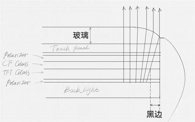 ↑↑↑通过对表层玻璃面板的边缘进行斜切处理,将屏幕边缘部分内容通过棱镜折射原理折射到表层玻璃斜面上,直接挡住屏幕黑边,从而实现了“视觉无边框”。
