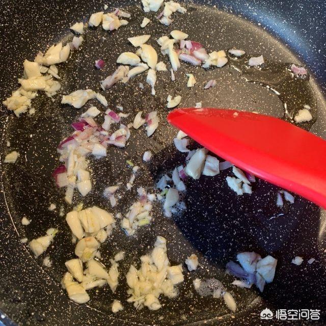 第2步、准备大蒜末、洋葱末。锅内倒入油,油7分热后倒入蒜末跟洋葱末煸香。