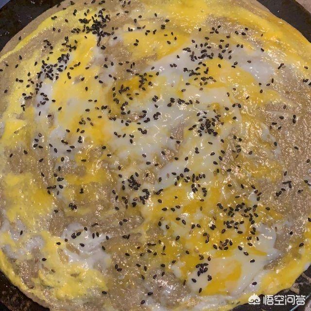 等到鸡蛋的蛋清熟了之后,撒上准备好的葱花和黑芝麻。等到煎饼的边翘起后,将煎饼翻一个面