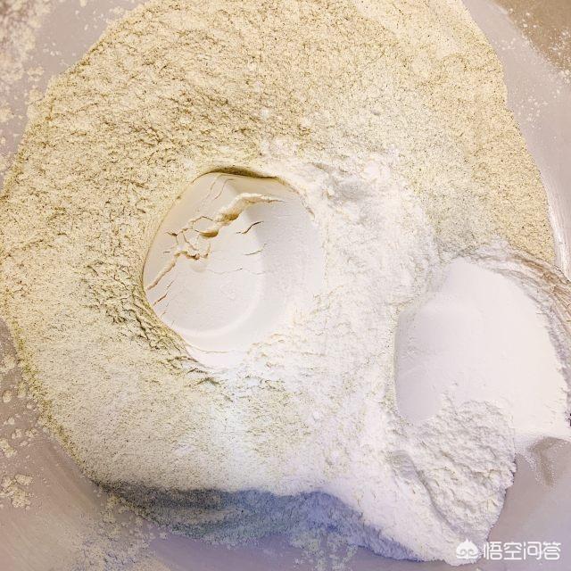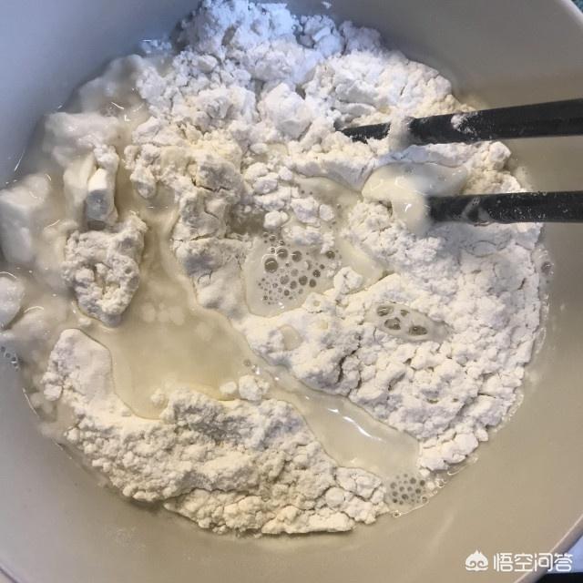 第5步、接下来我们来做煎饼果子里的薄脆: 把中筋面粉放入盆中,中间挖个小坑慢慢往里加水,用筷子把面粉搅成絮状,然后加入一小撮盐和2勺油,把面和成偏硬的面团。(注意:水要慢慢一点点加入,以免加多了面团过软,因为不同面粉吸水性不一样,这里没有给出面和水的配比,可以自己根据面粉情况一点点加水)
