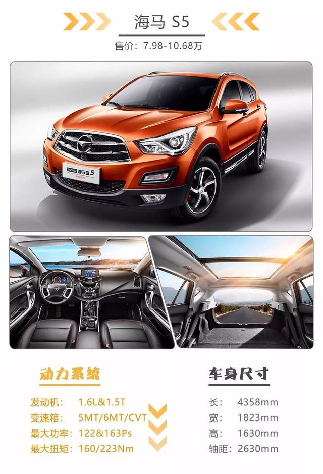 动力上是海马S5的一大亮点,最大功率为163马力的1.5T发动机在同级中已属优秀水平,201mm的最小离地间隙也让它拥有更好的通过性。除此之外,内饰质感也表现不错,但是中控台实在是算不上美观,设计还有待进一步加强,而改款之后的海马S5销量也有明显提升,得到了不少消费者的认可。