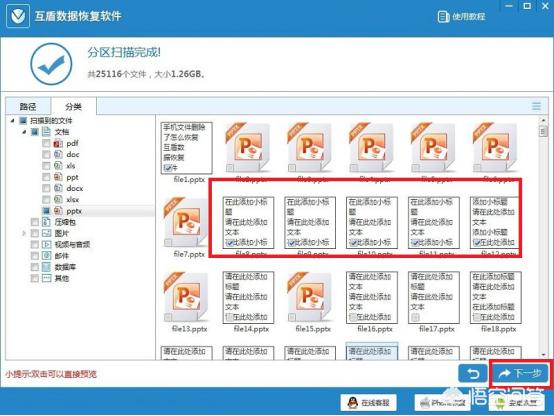步骤四:扫描完成之后,在界面左侧找到误删文件对应的格式点击,右侧就显示有具体的文件信息了,在其中找到需要恢复的文件勾选上,之后点击【下一步】按钮。