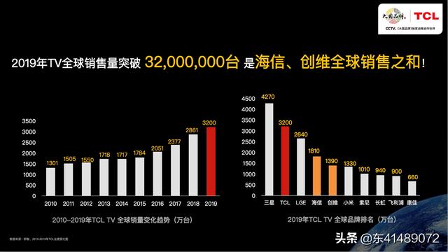 一线品牌目前只有TCL,海信和创维,由于TCL10年就投入液晶面板制造,19年凭借QLED量子点技术优势和性价比,全球第二国内第一,3200台出货量,是第二第三海信和创维电视出货量总和。