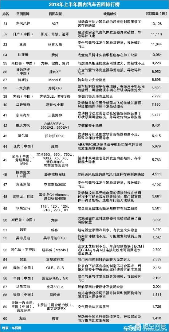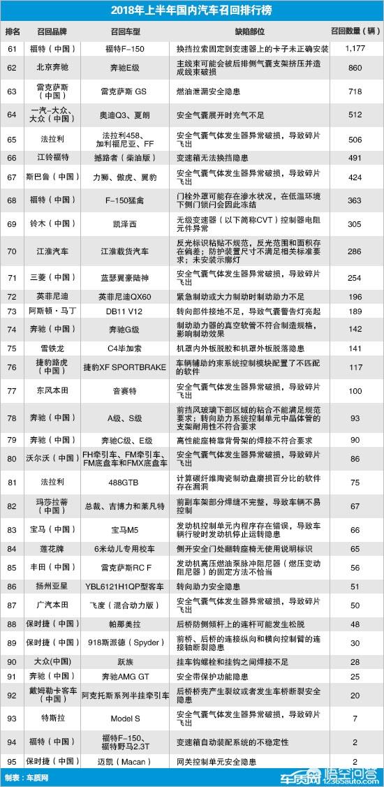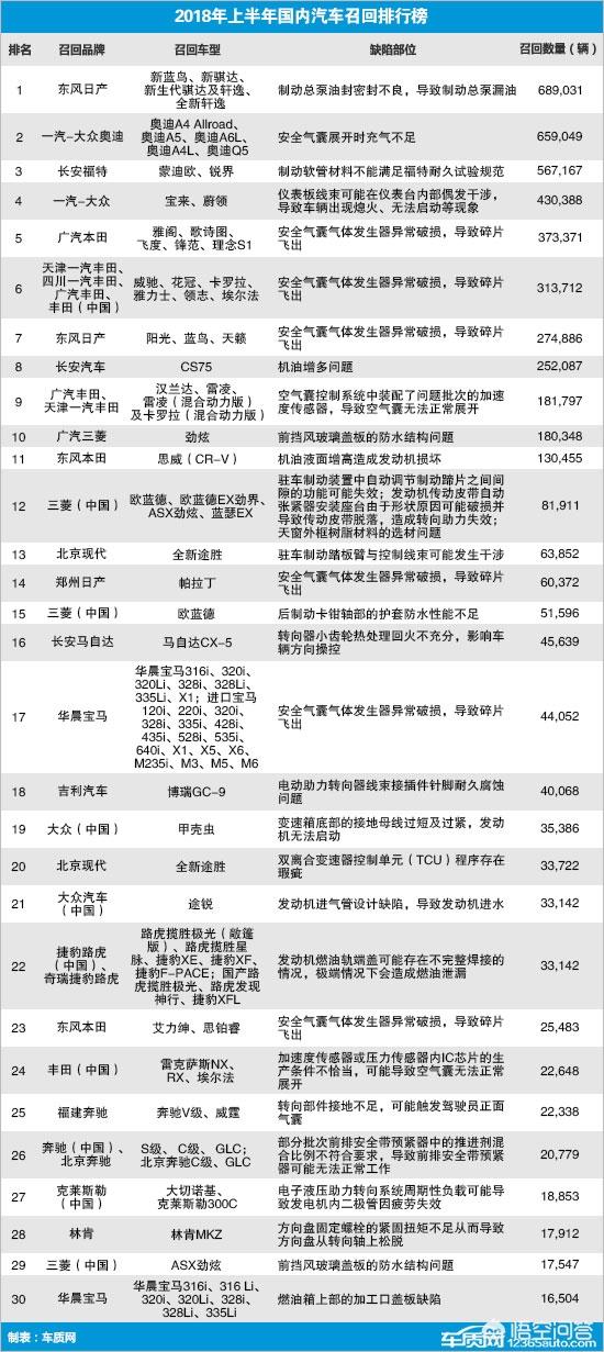 为便于消费者更加清晰的了解上半年国内召回情况,车质网将国家市场监督管理局公告进行整理,按召回数量由大到小进行排序,最终得出以下排名: