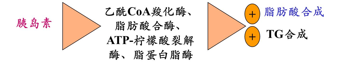 因为进食糖类而糖代谢加强,NADPH及乙酰CoA供应增多,异柠檬酸及柠檬酸堆积,有利于脂酸的合成。
