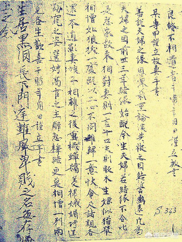 盖说夫妇之缘,恩深义重,论谈共被之因,结誓幽远。凡为夫妇之因,前世三年结缘,始配今生夫妇。若结缘不合,比是怨家,故来相对。妻则一言十口,夫则反目生嫌。似猫鼠相憎,如狼犬一处,既以二心不同,难归一意,快会及诸亲,各迁本道。愿妻娘子相离之后,重梳蝉鬓,美扫娥媚,巧逞窈窕之姿,聘高官之主,解怨释结,更莫相憎。一别两宽,各生欢喜。于时年月日谨立手书。