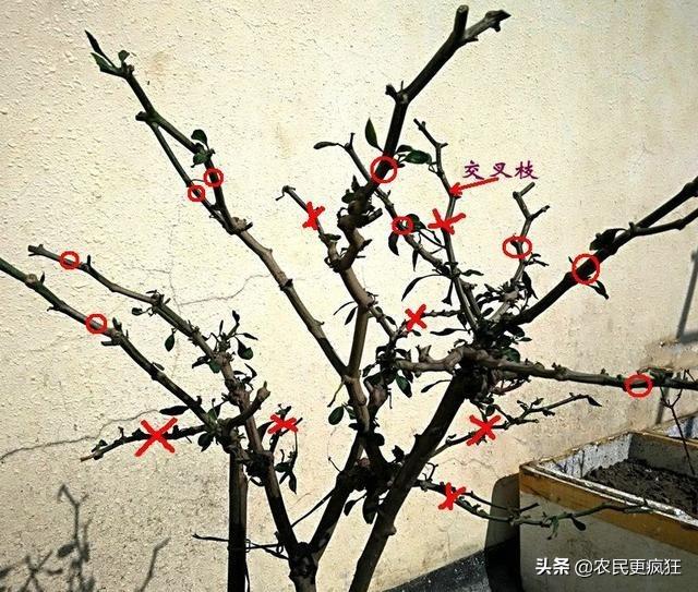 辣椒树剪枝过冬,嫩的剪掉(x位),老的留着(o位),让树苗木质化。