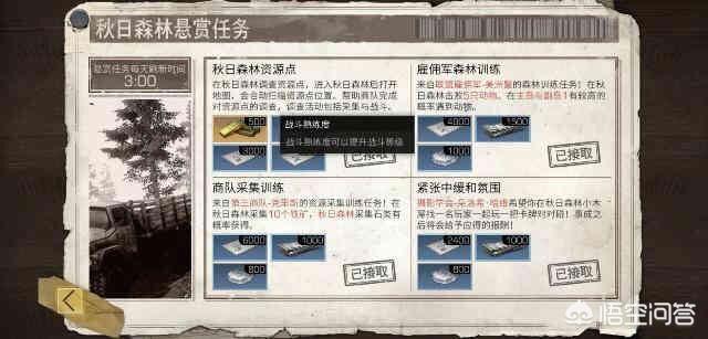 3、秋季森林奖励任务,这个任务可以被每个玩家接收,每天可以做四个任务,每个任务都比较简单,但是这个奖励非常丰富,比如击败5个动物,奖励4800个战斗技能度和1500个SGD加1000技能点,这只是一项任务。如果所有四项任务都已完成,则熟练程度将超过10,000(具体熟练程度取决于玩家级别)。如何获得秋季森林奖励任务?每个小木屋门口都有一张卡片,卡片收集在卡片上,与商会相同。
