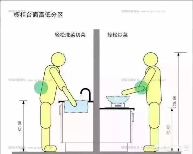 一个让使用者满意的橱柜,在设计上要充分考虑使用者的各种因素,从地柜、吊柜到台面,其高度都需要结合个人高度及操作习惯进行设计。