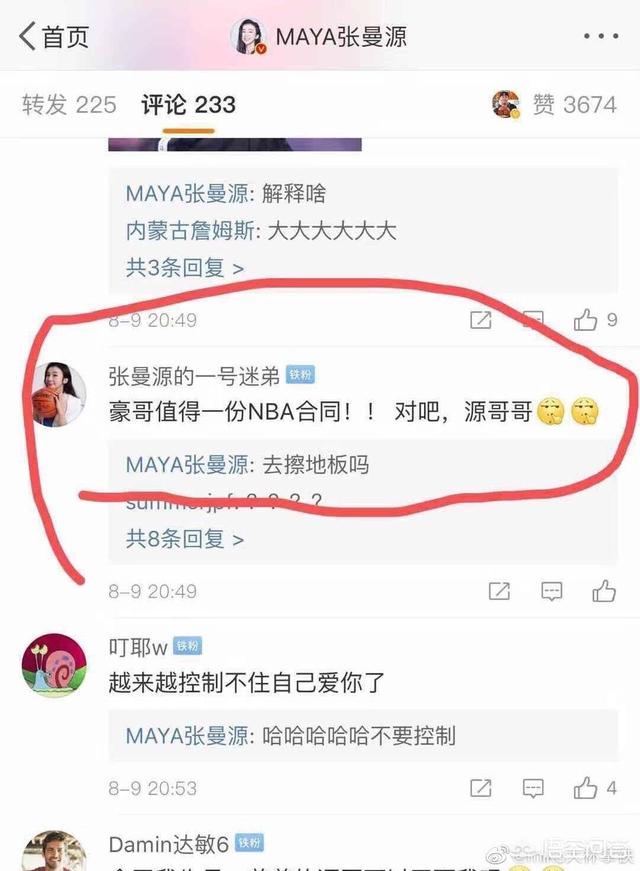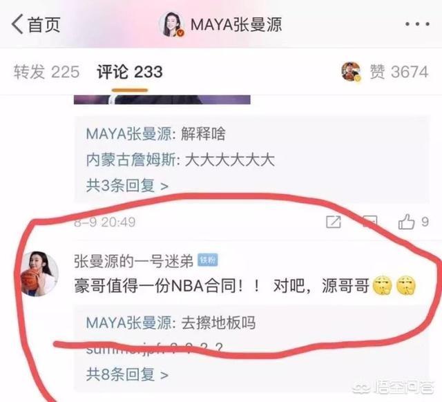 8月9号,张曼源的一条微博瞬间炸开了锅,因为她这条微博公开diss林书豪。有球迷问她:豪哥值不值得一份NBA合同?谁也没想到她竟然回答:“去擦地板吗?”