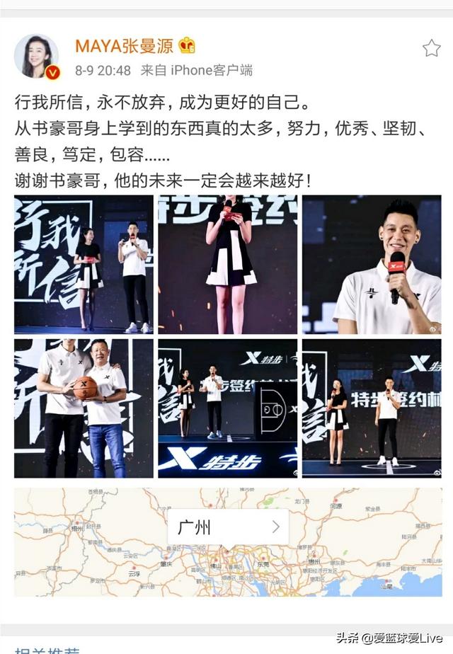 事情还要回溯到8月9日,当天张曼源发布了一条微博,这条微博是林书豪被国内某一运动品牌签约的事。她在微博上晒出与林书豪的多张合照,并且赞美了林书豪,还感谢了他。可以看到,当时张曼源是发布会的主持人。
