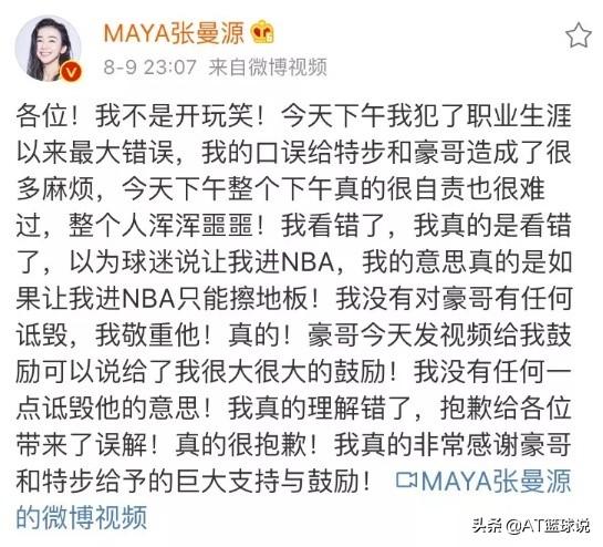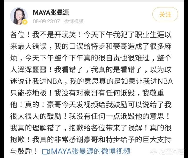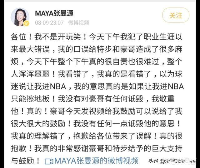 刚看到这个微博,本人也很纳闷,按理说,张曼源的情商不会这么低,林书豪人缘这么好,应该也不会和谁有过节。正在准备diss张曼源的时候,她大晚上终于发了条解释的微博。原来,她就是看错了而已,她浑浑噩噩地把豪哥看成了源哥,以为球迷是在问她能不能打nba。