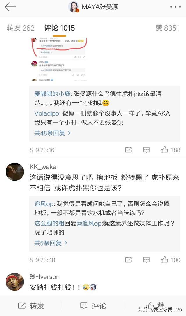 然后,下面就有不少人与张曼源互动。就在她的一个粉丝问林书豪是不是值得一份NBA合同的时候,张曼源回应“去擦地板吗”。也就是这个回复,引发热议。如果她真的是针对林书豪说的,那就太过分了。且不说人家值不值得,用“擦地板”来回应太侮辱人了。不过后来她意识到问题,第一时间删除了这个回复,但是网友早就截图了。一时间,风雨四起。