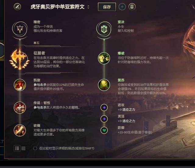 征服者的回血效果配合亚索的高伤害效果显著,尤其是中期亚索有了攻速装备后配合大招的破甲效果,在单挑中十分的强势,副系点出主宰的双吸血,让亚索在对线期也能有一定的回复能力。