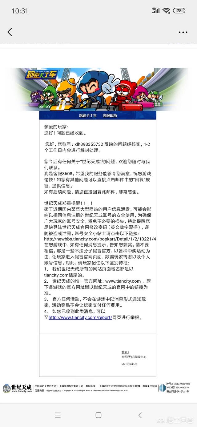 很高兴能为您解答,我也同样遇到了这个问题。今年3月23号晚上,我正常登录跑跑卡丁车,输入完账号密码,然后电脑屏幕上就出现了,此账号已被封停,详情请登录官网查询。我当时火就上来了,怎么回事?难道是有人盗我号了?,给我停了,还是我个人的原因呢?我也没有使用外挂玩啊,正常玩的。我就去官网上查询,违规使用外挂的账号。查询搜索发现没有我的角色名称,然后我就去问了一下客服,说明了我的原因。等待了一会,客服说了,今年2月份,您在登录此账号时数据异常,系统保护性封停了账号。只要该账号出现异常情况就会被封停。我们相信您没有进行操作,但是系统检测出账号有过。我跟客服说: 我也没有使用外挂,没有使用非法程序啊?客服就说,需要下载世纪天成管家APP软件,在里面进行特权认证通道,需要身份证号,姓名,手机号认证通过了 ,提交了再和客服联系。于是我就填写了身份信息,邮箱,还有角色名称,交给客服提交了。客服说请您耐心等待,处理完结果会第一时间发送到您的邮箱里的。我就想应该没有问题吧,能给我找回来吧,我也是半信半疑,但是我是真的没有用外挂玩游戏的习惯,身正不怕影子斜,哈哈等待吧!一天两天----等了一周了, 还没有消息?气的我脑袋都大了,问客服就是让我耐心等待结果,我这个人就是急脾气,别提有多闹心了,明明就不是我的错,是你们给我搞错了,还处理的这么慢,真的无语了!后来我也不问了,爱咋咋地吧,不行我就重新注册一个号吧,就是有点舍不得,都玩了这么长的时间了,都有感情在里面了。时间就这么一天天的过去了 突然有一天邮箱来信息了,里面写到亲爱的玩家:您好!问题已经收到。您账号反映的问题经核实,1-2个工作日内会进行解封处理。当时我看到,眼泪都快流出来了,真是皇天不负有心人,破镜重圆了。