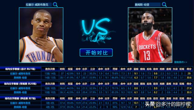 哈登季后赛场均得分低和生涯早期在雷霆打的三年季后赛都是第六人有关系,综合来看就是哈登不愧是得分后卫,威少不愧是控球后卫的场均数据区别。