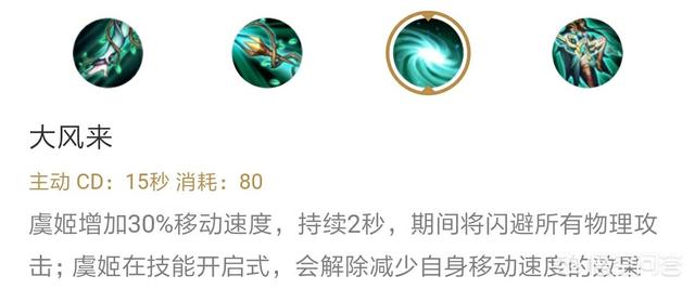 二技能大风来:恰到好处的释放能够很好的躲避来自物理系伤害的致命危险,还能解除减速效果,可谓是虞姬的摆脱致命危险的逃生利器。二技能加闪现,逃跑像风一样。