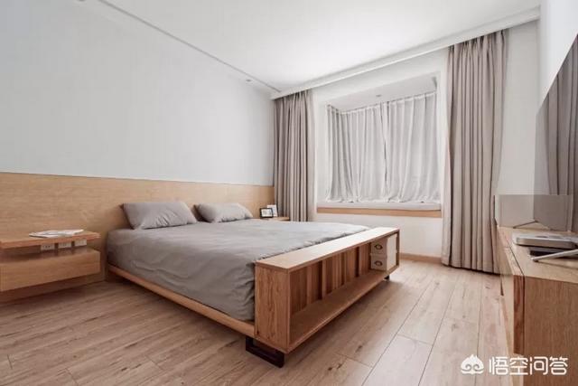 在床尾设计了独特的收纳空间,两边的床头柜和床也是专门定制,飘窗没有做什么装饰性的设计,木工板+白橡木饰面板+清漆的组合下特有的飘窗就完成了。将自然界的材质大量运用在卧室中,重视实际的收纳与沉静的睡眠功能。